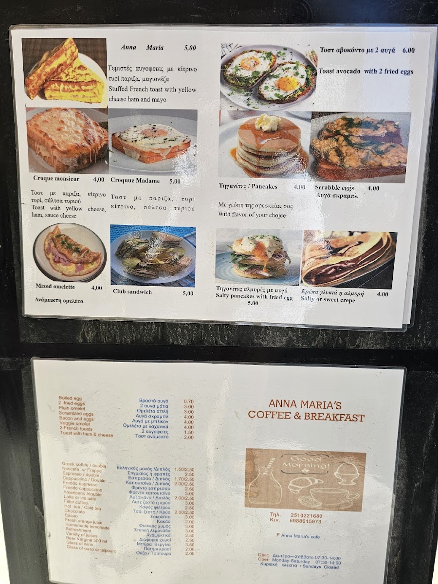 Anna Maria's Cafe offers a diverse menu that caters to both traditional and adventurous palates. Start your day with their delightfully fluffy American breakfast, available for just €6.0, or indulge in the unique Anna Maria Stuffed French Toast, packed with yellow cheese, ham, and mayo, that’s equally satisfying at €6.0. For those craving something savory, the Club Sandwich, priced at €5.0, boasts layers of flavor that make each bite a joy. Don’t miss their Salty or Sweet Crepes at €4.50, which can be customized to fit your mood, or the comforting Croque Madame Toast topped with a perfectly fried egg at just €5.0.